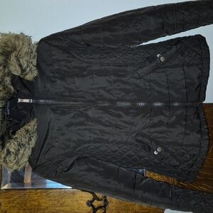 Coat is a dark brown. No flaws but the fur on the hood can not be removed. It looks different before I washed it.