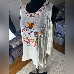 This elegant white blouse from ODDY features a bib collar and 3/4 sleeves, adorned with intricate floral embroidery in warm autumn hues. The cut-out sleeve design adds a touch of modern flair, while the soft fabric ensures comfort and style. Perfect for casual outings or adding a boho-chic element to your wardrobe.