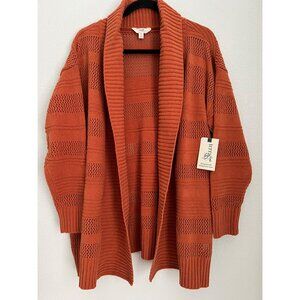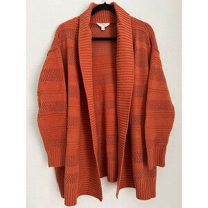 This cardigan, in a rich rust orange, combines comfort with a stylish open-knit design. Its open-front style and shawl collar make it versatile for layering, while the mid-weight knit provides warmth. Designed for ease and elegance, this piece is suitable for both casual and more polished looks.