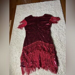 Stunning red dress with sequins and fringe details. Perfect for a night out.