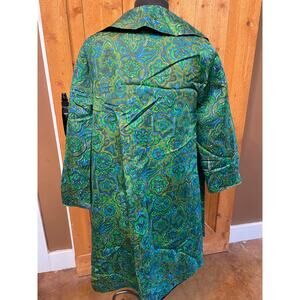 Women's Large Reversible Trapeze Coat Jacket Water Resistance Lightweight. Print on one side and black on one side. Bottom button missing on print side. Length 39". Pit to pit 20".