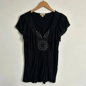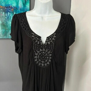 Women’s Large Sequin Black Top Crochet Ballon Hem Flowy Flutter Sleeve Stretch