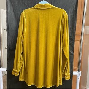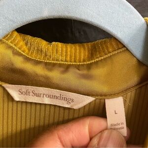 Elegant golden blouse by Soft Surroundings. Features a smooth texture and classic design. No visible flaws; excellent condition. Approximate measurements below:
