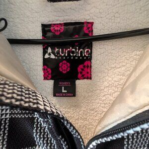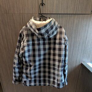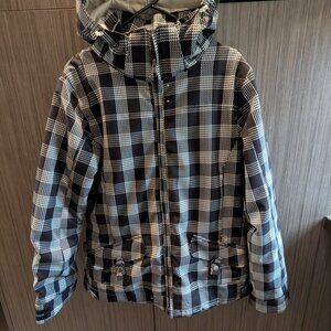White and black checked ski/snowboard jacket, size Large, with removable hood. Very warm. Has a powder skirt.