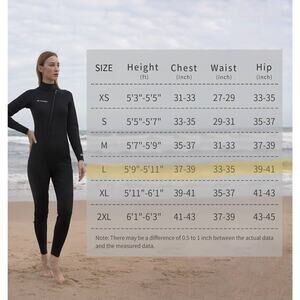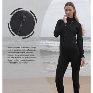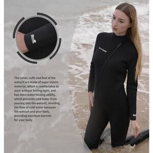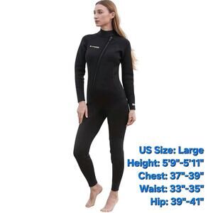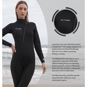 This women's large wetsuit by Layatone is a 3mm neoprene full body suit with a front zipper closure. It features long sleeves and a chest size of 41 inches. Designed for diving, this wetsuit is suitable for adult unisex use and comes in a women's 3mm full suit color. With a sleek design and high-quality material, this wetsuit offers both comfort and functionality for water sports enthusiasts.