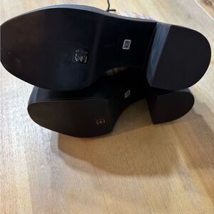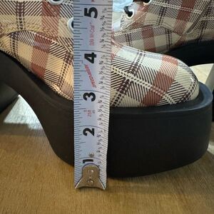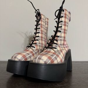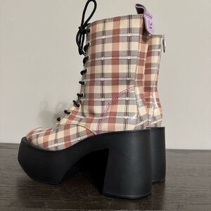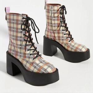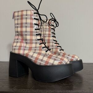 New without box. Right boot pull tab is pulled off as shown in photo. Larroude Olivia patent leather plaid platform combat boots. Size 8. Lace up and zip zip closure. $430 retail. See photos for measurements