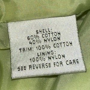 Women's Larry Levine Honeydew Windbreaker Jacket Size Small. Color: Honeydew. Made from: Shell: 60% Cotton 40% Nylon, Trim: 100% Cotton, Lining: 100% Nylon. Machine Washable. This jacket features padded shoulders, cinch waist, front pockets and side arm pocket. This jacket is in good condition. There are minor spots on various parts of the jacket (see pictures). They are barely noticeable and do not affect the function of the jacket. There are no rips, tears, sor damage. Ships from a Smoke Free Home. Any questions, please ask. All reasonable offers welcome.
