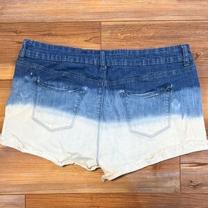 Elevate your casual wardrobe with these chic ombre jean shorts. Featuring a stylish blend of blue and cream, these shorts are perfect for any laid-back occasion. Raw edge and distressed.
