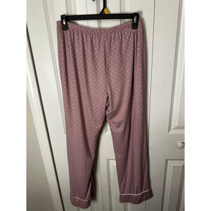 This pre-owned Laura Ashley women's pajama set in size XL features a dusty rose pink fabric with small white polka dots. The two-piece set includes a short-sleeve button-up top with a collar, chest pocket, and white piping accents on the collar, placket, pocket, and sleeve cuffs. The matching long pants have an elastic waistband and white piping along the cuffs. The material composition is 90% polyester and 10% spandex. No significant visible imperfections or signs of wear are apparent in the images.