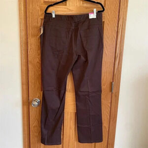 These women's Laura Scott straight leg pants in size 14 and come in a regular fit. They are brown in color and made from a blend of cotton and spandex, offering a slenderizing fit with a tummy panel feature. Suitable for casual outings or office wear, these pants are manufactured in Vietnam. New with tags.