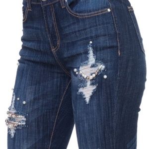 These dark denim, trendy, distressed jeans with pearl details will really make you stand out. A statement piece all their own, pair with a fun blouse or cami to let your legs steal the show.