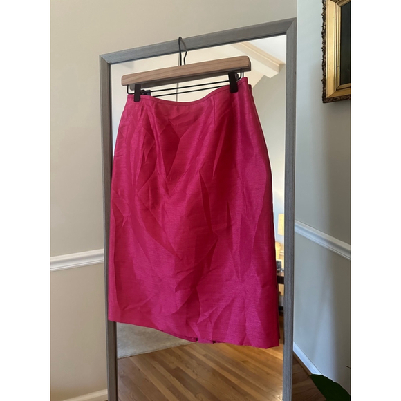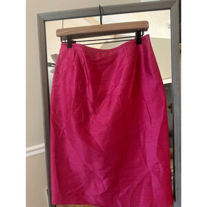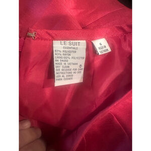 This is a pre-owned Le Suit Essentials skirt, size 6. It features a vibrant pink color and a pencil silhouette. The material composition is 57% polyester and 43% rayon, with a 100% polyester lining. The skirt has a rear zipper closure and a back vent. There are no visible stains or tears. The skirt appears to be in good condition.