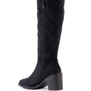 A side zip closure adds easy wear to a versatile over-the-knee boot balanced by an almond toe and stacked block heel.
