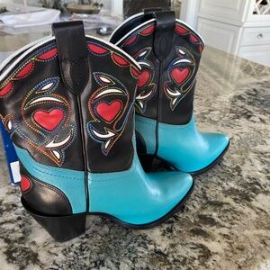 Never worn, 100% leather made in Portugal multi colored mid-calf western boot. 3” heel. One purple scuff mark on inside of right boot as noted in picture. Size 7.