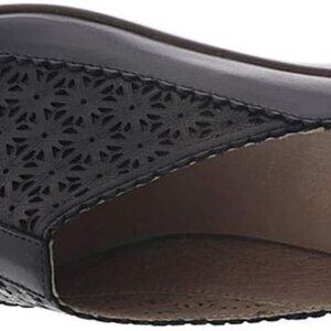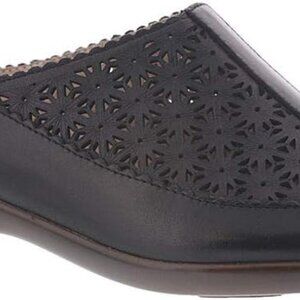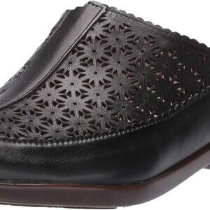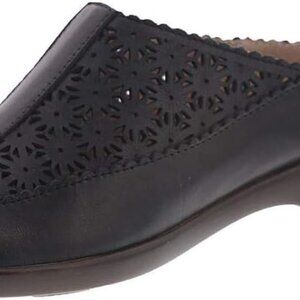 Features: These stylish slip-on mules are crafted from soft, genuine leather with a scalloped trim and laser-cut floral details that add a feminine touch. The cushioned insole and contoured footbed give all-day comfort and good arch support, while the breathable perforated upper prevents overheating. Easy to wear and lightweight, they’re perfect for running errands, casual Fridays, or weekend outings.