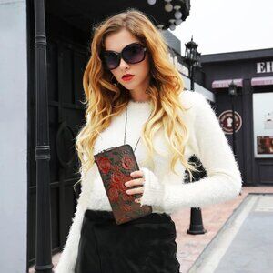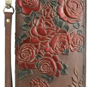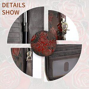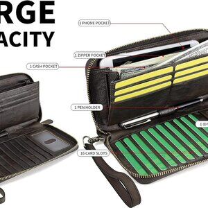 Features: Made from smooth leather with a chic coffee hue, this spacious wallet doubles as a clutch. It’s perfect for organizing cards, phone, and essentials all in one place. The RFID blocking feature is a bonus for added security. Zipper closure keeps everything secure.