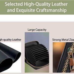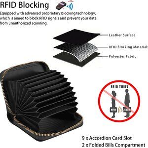 Features: Compact and lightweight, measuring about 4.33 x 3.15 x 0.98 inches, perfect for slipping into your pocket or purse. Features accordion-style card slots for easy access and better organization. Holds up to 9 cards plus folded bills, cards, cash, and receipts. Crafted from high-quality leather, it’s durable, waterproof, and easy to clean. The smooth zip-around closure adds security and convenience. Features RFID blocking technology for added security.