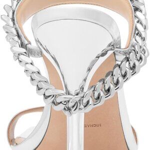 Features: Stunning metallic leather sandals with an oversized chain-link detail that makes a bold statement. Features a square toe and a tall 4-inch stiletto heel—ideal for elevating any look. Pull-on design ensures easy wear.