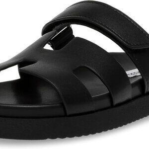 Features: These chic flat flatform sandals are crafted from smooth leather with a trendy geometric cutout on the wide front strap. They have an adjustable hook-and-loop strap for a secure fit, a molded footbed for all-day comfort, and a 1.25-inch treaded sole that adds a little height and grip. Perfect for casual outings, brunch dates, or dressing up a summer look.