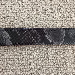 Women’s snake print leather belt with silver metal buckle. Black and grey tones. Leather strap measures approximately 38” excluding buckle. Strap is approximately 1.25” wide.