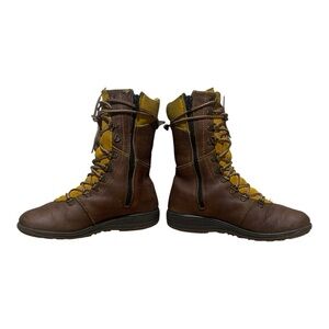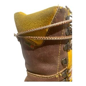 Very high end hiking boots from Canada. Leather and suede waterproof trail boots. Stylish brown and yellow lace-up boots. Perfect for outdoor adventures.