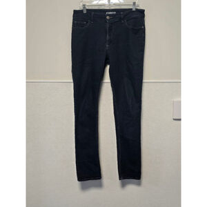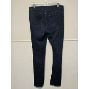 Pre-owned Lee Riders Curvy Fit jeans in dark wash denim. The jeans are a straight leg style with a button and zip closure. They feature five pockets, belt loops, and a classic denim construction. Measurements: Waist 32 inches ( should fit a 12/14 no size tag on jeans), inseam 30 inches. The jeans show minor signs of wear consistent with previous use, but are free of significant damage or stains.
