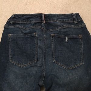 EUC women's Lee brand dark Jean capris size 8. Factory fraying as shown in pictures. Inseam is 28" and waist is 16" laying flat. I wore rolled up for capris but could be worn down for jeans or crops.