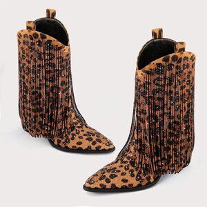 ⚡Women's Leopard Ankle Boots Western Rhinestone Sparkly Fringe Chunky Heel