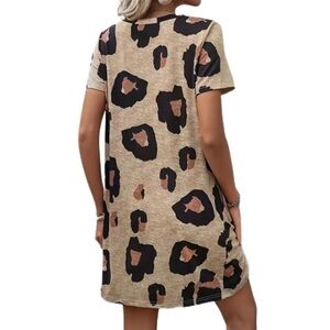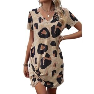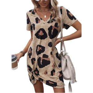 Stylish leopard print V-neck dress. Features a chic design with a comfortable fit. Perfect for casual outings.