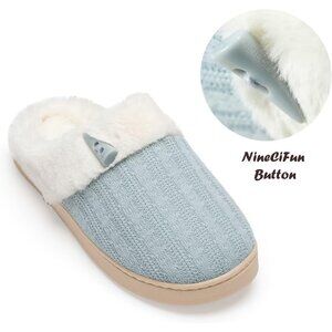 EASY SLIP ON STYLE:Step into comfort easily with these open back fuzzy bedroom slippers that are made with fluffy plush.Soft plush faux fur lining offers superior comfortability from the clouds.Also these comfy house shoes are so chic with knitting upper and horn button design.They're the perfect house slippers for women and girls.