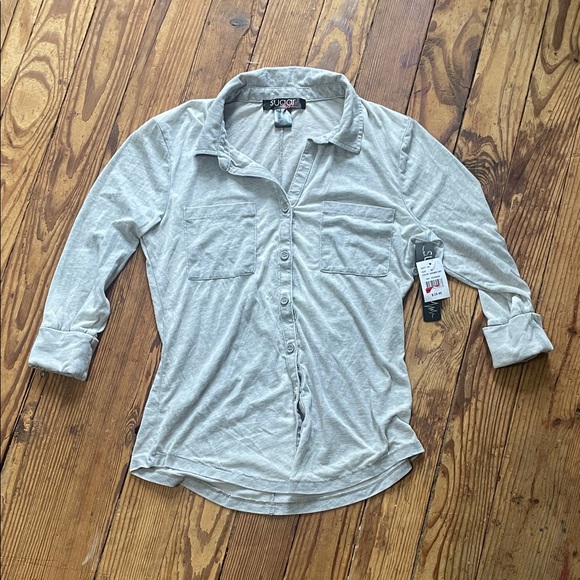 Upgrade your wardrobe with the SUGOI women's light gray button-down shirt. Perfect for casual outings, it features dual chest pockets for added style.