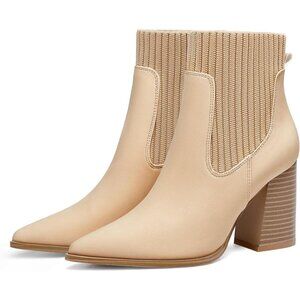 ⚡Women's Light Khaki Ankle Boots Sock Pointed Toe Chunky Stacked High Heel