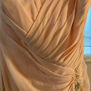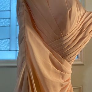 Light pink strapless bridesmaid dress. Zips in the back, and is long and flowy at the bottom. Great for wedding or prom. Worn once in a wedding. Size 12. Discounted due to slight discoloration in underarm area which will require some dry-cleaning. Color: Light pink, baby pink, primrose pink, blush