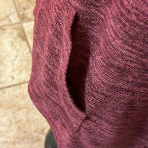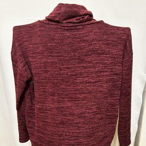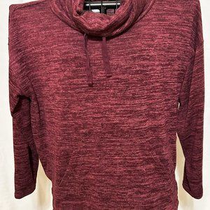 Light sweater loose turtleneck, front lower pocket, maroon color, very soft, fabric is 83% Polyester, 14% Rayon & 3% spandex. Machine wash cold with like colors.