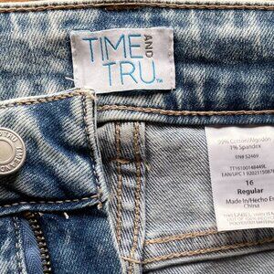 Great 16 Regular Light Wash Cropped Jeans by Time and Tru. Features relaxed straight leg fit, high rise, silver metal button with zip fly front closure, 5-pocket styling, belt loops, cropped length, and raw-edge hems. Crafted from high-quality, stretchy denim, these jeans ensure all-day comfort and a perfect fit a flattering straight leg cut with a stylish cropped length. Elevate your casual style effortlessly offering a versatile look for any occasion, perfect to pair with a top or tunic, sweater or hoodie! with these must-have jeans. Machine washable. NEW, clean, no stains or tears, smoke-free. Bundle and save. Feel free to view my Closet. Thank you!