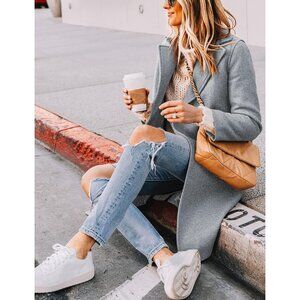 Features: notched lapel, v neck, two side pockets, knee length, solid color, slim fit, long sleeve