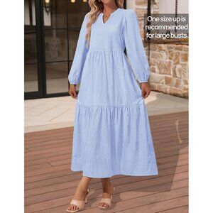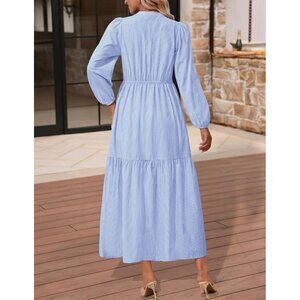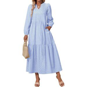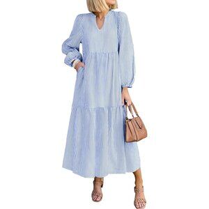 Features: This breezy maxi dress features a relaxed fit with classic stripes, a flattering V-neckline, and puff sleeves that add a touch of elegance. The high waist and swing-pleated hem keep it super comfy and effortlessly stylish. Plus, it has two handy pockets, making it practical for everyday wear.
