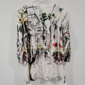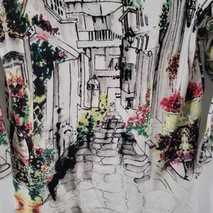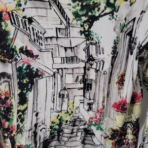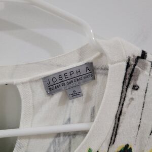 This women's lightweight sweater in size small features a tight-knit design with a round neckline and 3/4 sleeves, making it suitable for travel, casual, or business occasions. Made from a blend of nylon and rayon, the sweater has a white color and a European-themed watercolor art pattern, adding a touch of Italian style to your wardrobe. With a regular fit and stretchy fabric, this pullover sweater is versatile for all seasons, whether it's winter, summer, fall, or spring. Made by the brand Joseph A, this sweater is a stylish and comfortable addition to any woman's clothing collection.