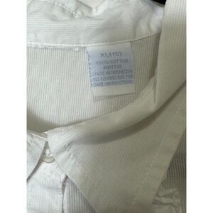 Women's Lightweight White Cotton Pinstripe Tuxedo Blouse Front Ruffles Size 18. Lightweight 100% Cotton white on white button down tailored blouse with two sets of ruffles down the bodice. Excellent pre-owned condition, no rips, tears, snags, pulls or stains.