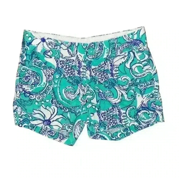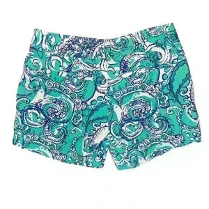 Pre-owned Lilly Pulitzer women's Sea and be Seen Callahan shorts in size 00. The shorts are made of a cotton blend fabric and feature the Sea and Be Seen print in shades of teal, white, and purple. They have a zip fly and button closure, two front pockets, and two back pockets. The shorts measure approximately 10 inches in length, 14 inches in waist, and 18 inches in hips. The shorts are in good condition with no visible signs of wear or damage. The fabric is soft and comfortable, and the colors are vibrant. The shorts are perfect for a casual summer outfit.