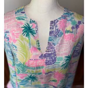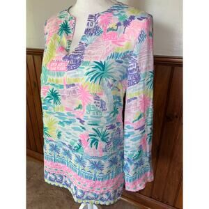 Womens Lilly Pulitzer Ocean Cove 100% Linen Tunic Blouse Top Blue Pink Size XS