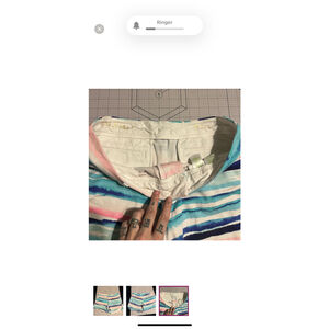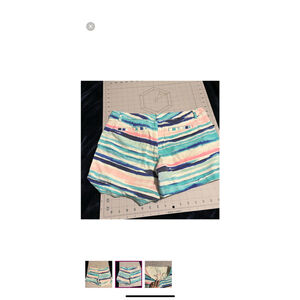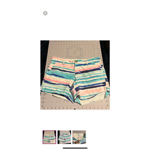 These are pre-owned Lilly Pulitzer shorts featuring a colorful striped pattern in shades of blue, pink, and white. The shorts have a button and zipper closure, belt loops, and front and back pockets. The material appears to be a cotton blend. There are no visible stains or tears. The size and model information are not visible in the provided images.