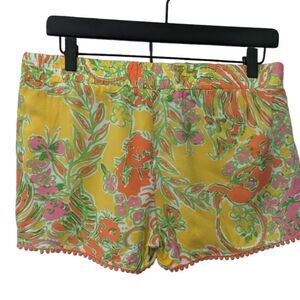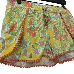 Women's Lily Pulitzer for Target Colorful Floral PomPom Challis Shorts, Small. Elastic waistband with a tie that has two metal ends. Lightweight and comfortable shorts with pink pompom details. Excellent condition. 100% Rayon.