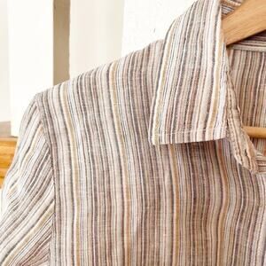 Womens Linen Button-Down Shirt Beige Striped Long Sleeves Collared Size 46