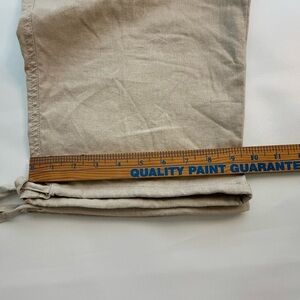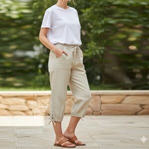 Women’s beige linen cotton blend wide leg, cropped pants, functional front and back pockets. No zipper button anti-closure. Elastic waistband and back ads about 2 inches like new condition. Logo is almost vintage Fashion Bug