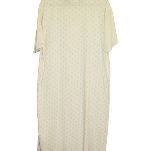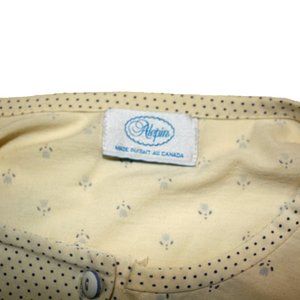 Women's medium Alepin long nightgown, short sleeves in good condition except missing one button on top and found a small stain after holding it up to sunlight on the front. Otherwise that was not noticeable. Nice quality night wear.