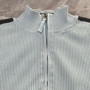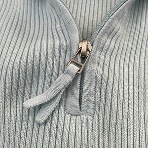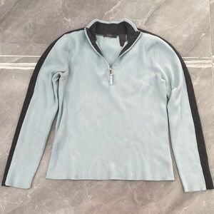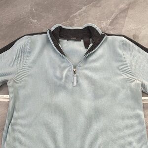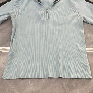 Okay condition - Women's Liz Claiborne Quarter Zip Pullover Collared Sweater. Has a tiny stain on front bottom and back of left armpit looks like it’s starting to separate (as pictured). Colors: light blue and gray. Size: L.