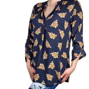 Women's Loft blouse navy floral long sleeve roll tab hi low hem tunic Like new condition pit to pit: 20" Back side from top of collar to bottom (laying flat): 29" Shear fabric Beautiful piece T4, B 60