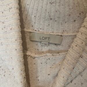 This is a size medium, Loft, turtleneck sweater. It is cream in color with brown speckles throughout. It is in excellent condition for a preowned piece.