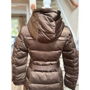 Women’s Long Belted Puffer Coat Sz S Brown Quilted Winter Jacket Removable Hood